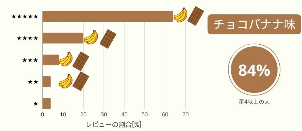 某ECサイトのチョコバナナ味のレビューをまとめると、「星5」評価が圧倒的に多かったです。